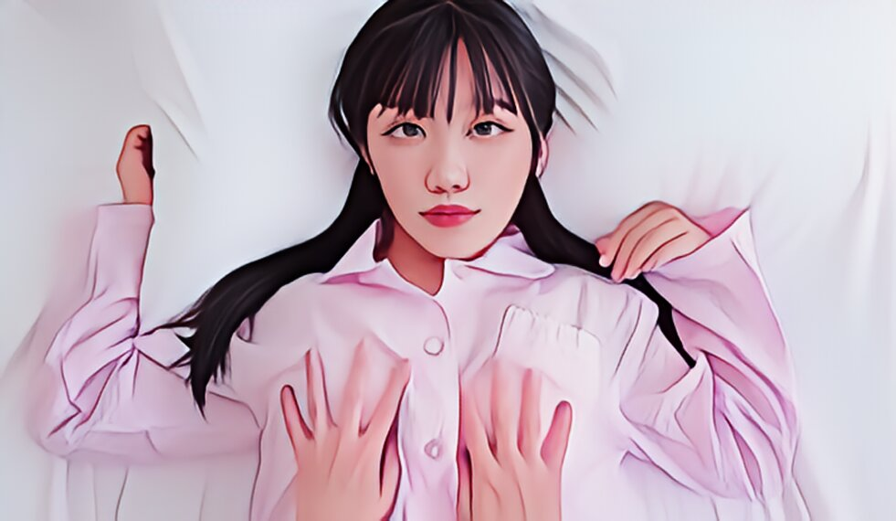 うっとりとした表情でカメラを見つめ、手を動かします。