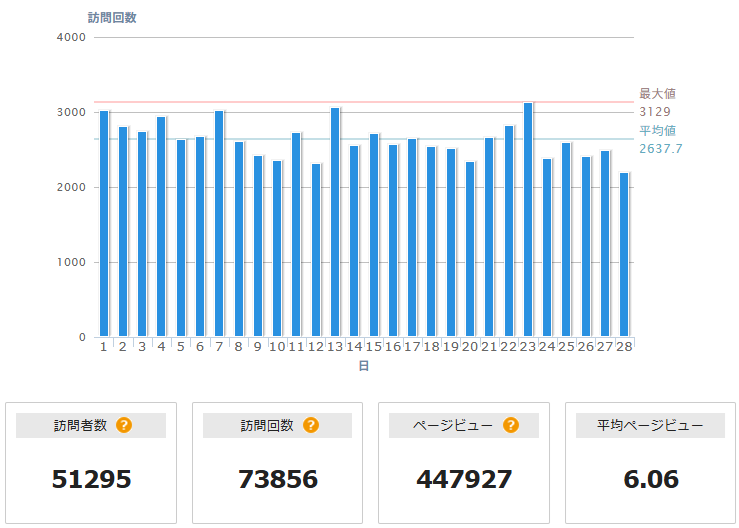 月の中も、飛び抜けてアクセスが多い日などなく、ほぼ常連さんがチェックしていただいてる状態に落ち着いているのだと思っています。